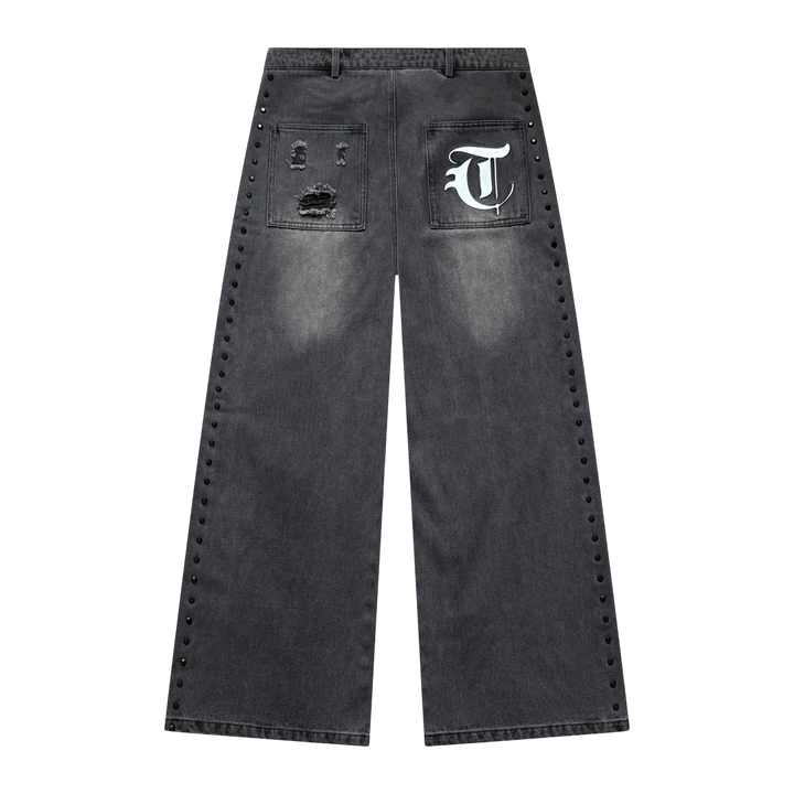 Washed black, rhinestone-detailed, and baggy where it counts. These jeans aren’t just pants—they’re a statement. Finished with custom side embellishments that catch the light and a wide-leg cut for a bold silhouette.